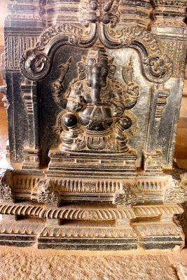In this part of Hampi we saw a lot of water buffalo wandering the grounds. The photo on the left is a group of adult and baby buffaloes grazing, and the photo on the write is a dark stone carving of Ganesh, the elephant god: